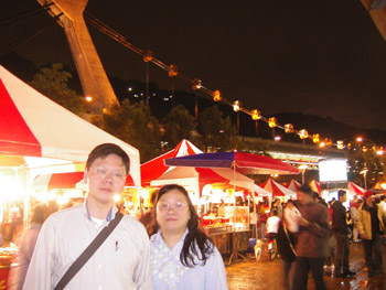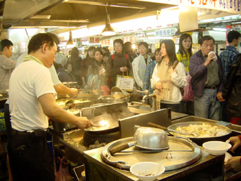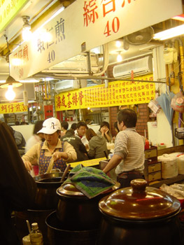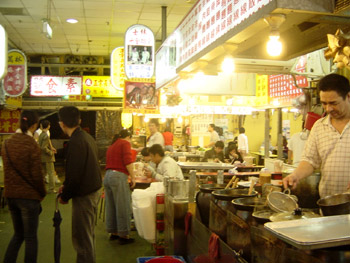 外面下著小雨,士林夜市的小吃部搬到這邊來了,有了屋頂就不會有吃東西到一半有水滴進脖子裡的事情發生。