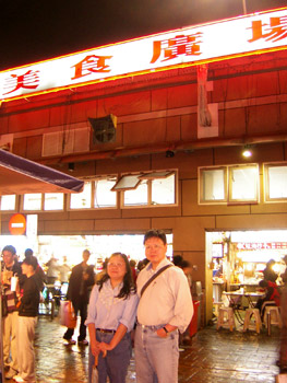 士林夜市"美食廣場"的外面,後面是龍舟造型的捷運劍潭站。